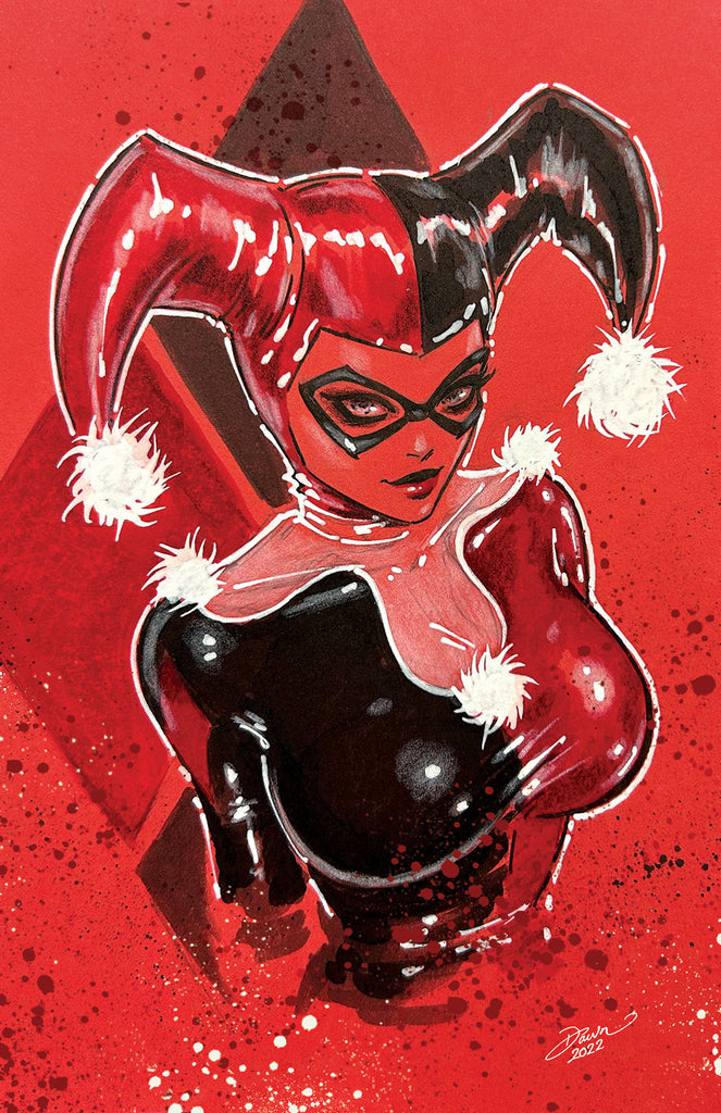 A commission of classic Harley Quinn from NYCC 2022, originally drawn on a red comic blank.